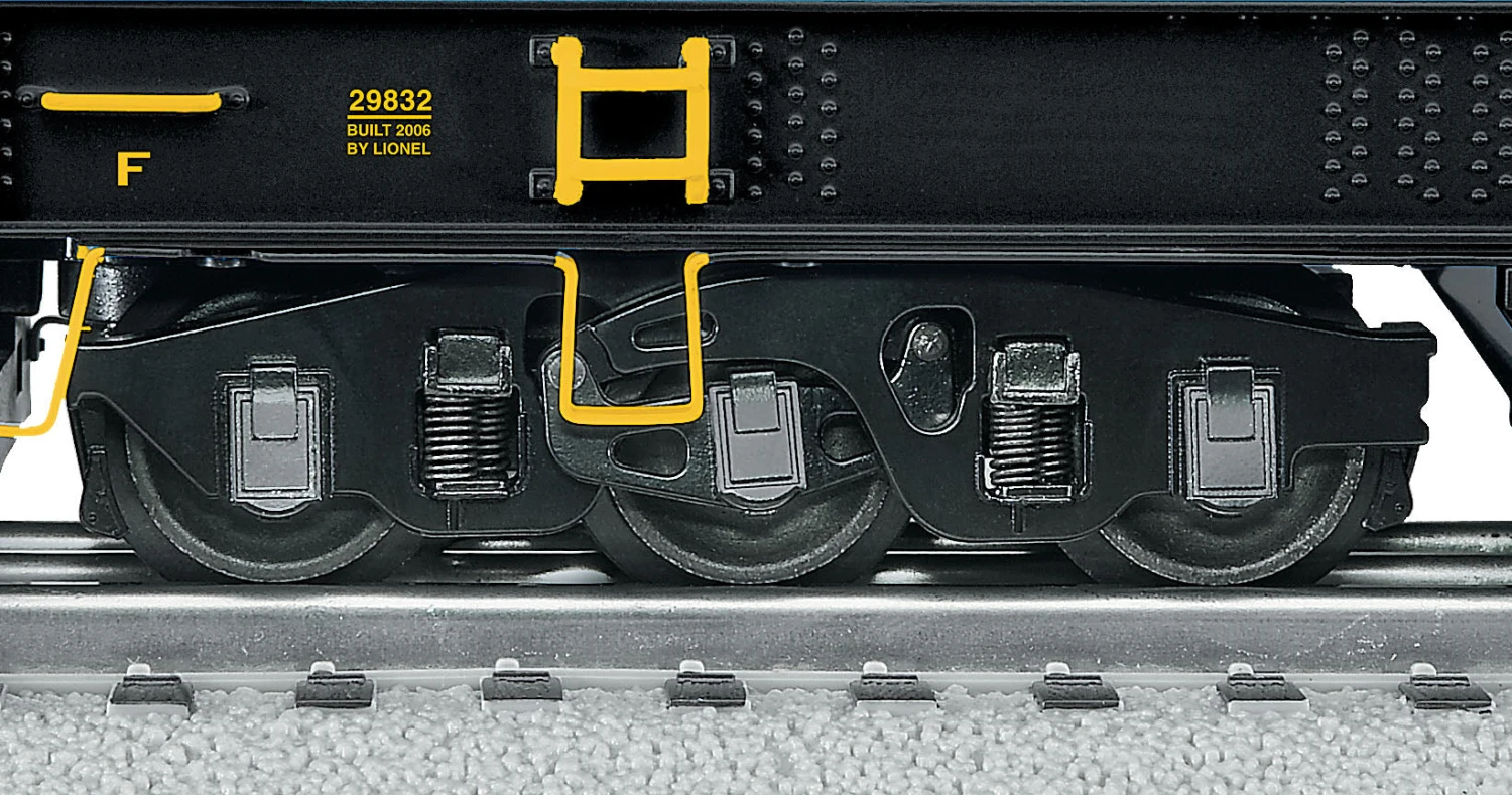 - Die-cast metal sprung trucks for improved tracking, especially through switches