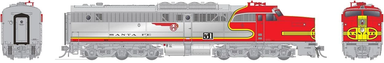 The popular ALCo PA and PB series returns for a second run! Following the success of the first run, Rapido is pleased to offer new schemes and a twist: ATSF 51A, B and L! These were the three Santa Fe PAs that were repowered in 1954 with 567C prime movers putting out 1750 horsepower. To account for the extra space needed to house the taller EMD power assemblies, the middle of the carbody was raised with the addition of dual exhausts and four button-top EMD-style fans. While successful, this endeavor was not economical in the long run and not repeated on any other ALCo PA.