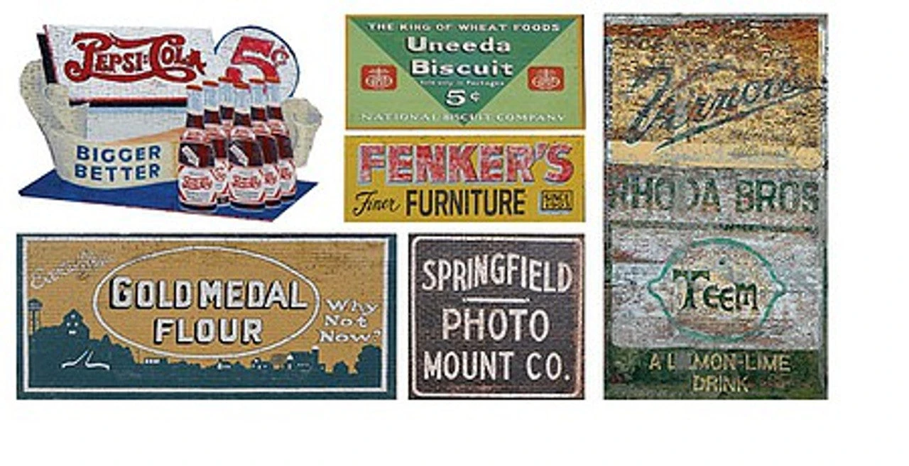 Pre-weathered waterslide decal signs are made using photos of real signs. Easily applied to structures and sign frames. Cut to fit with a decal scissors or hobby knife and apply using the manufacturer’s instructions. Decals are printed on a white decal base and must be trimmed to size.