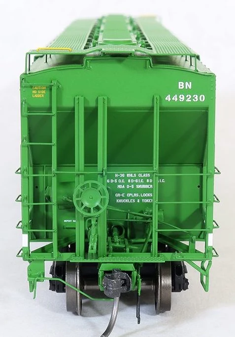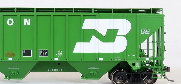 BN “Delivery Cascade Green 1-1980” is available in the striking “original cascade green” scheme with large BN logo and large Burlington Northern lettering. A highly accurate model, these cars are stunners and look great alongside our other BN releases for a great “family appearance” for your fleet. Featured details include prototypically accurate body-mounted brake hardware and scale-sized Miner “Selflok” outlet gates. Every panel of this car has BN and Pullman lettering applied. From the large BN logo down to the individual car numbers on the center sill and trucks – it’s all there. The Tangent model is the ONLY PS4750 model that has the proper phase characteristics to match these 1980 prototypes, BN’s one and only as-delivered PS4750 order!