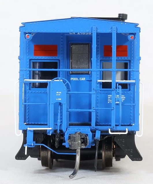 Conrail (CR) “N7 Blue Repaint 1977+” shows another take on a Conrail blue repaint. These offering models a caboose that did not lose its roof walkway and end ladders until Conrail’s formation. So what does this mean? The end railings are specific to this type of setup. Notice the vertical ladder styles have been maintained, even after the running board was removed by CR personnel. (The predecessor PC’s practice was to torch off these ladder styles during modifications.) This makes for a very distinctive look on the ends, one that we thought was worthy of modeling! These N7 cabooses have the classic Conrail blue paint, with red ‘Scotchlight’ rectangles on the ends. Note the red marker light pairs on the ends, which of course light up on our models. The Conrail cabooses continue the black-painted roofs found on the Penn Central cars, as well as 2-panel consolidated stencils. Each road number has accurate and distinctive lettering details to represent the two prototypical numbers offered. Per prototype photos, SKU 60126-01 maintains its plain bearing trucks while SKU 60126-02 has roller bearing trucks.