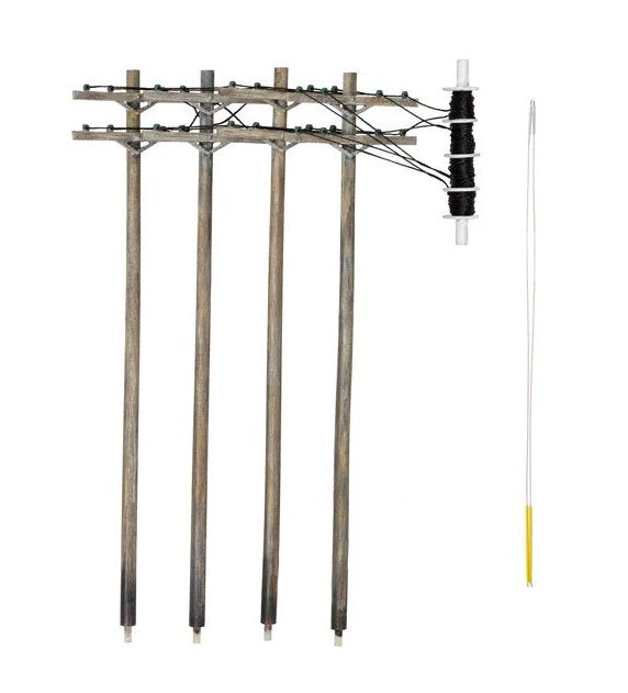 Line O Scale Double Crossbar Pre-Wired Poles alongside railroad tracks to model telephone poles used for communication on the railroad. They are hand-painted and feature weathered wood poles, guy wires and other authentic details. Pre-Wired Poles can be installed in minutes. Simply drill holes, pull poles out of packaging, slide along wire and plant in place.